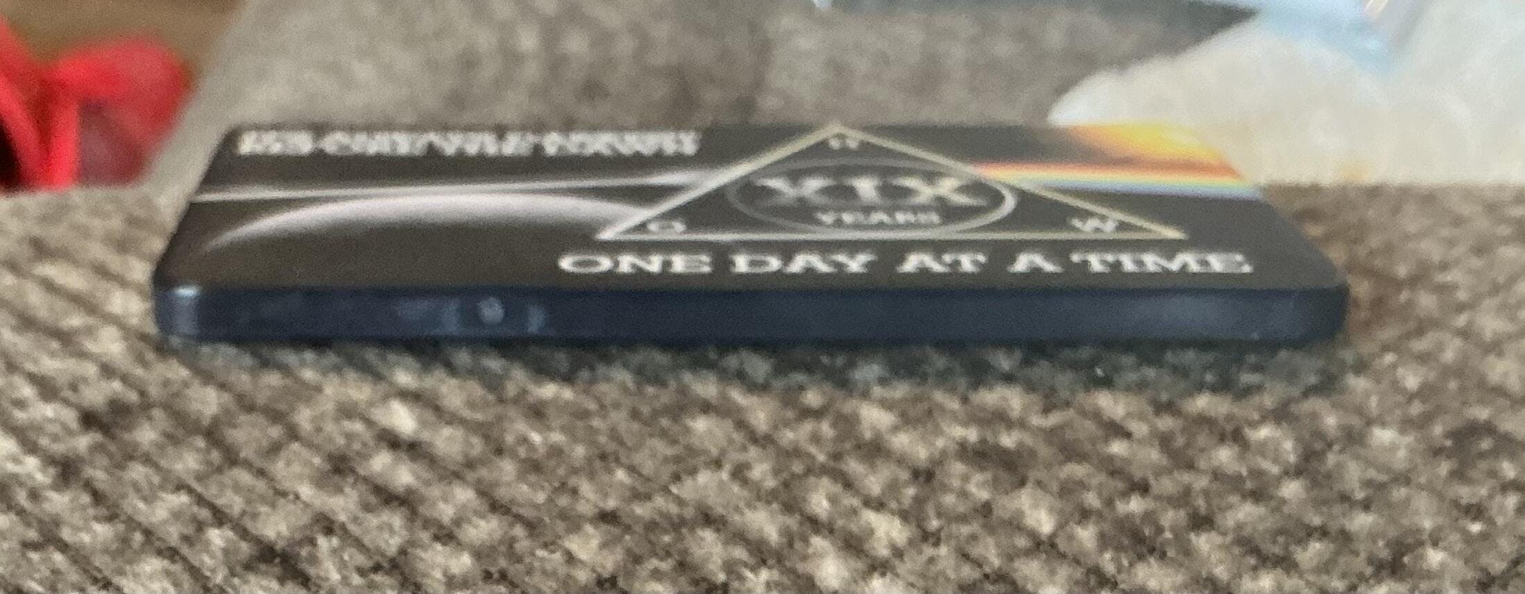 A completely different kind of AA and Recovery chip. This sobriety chip makes a great recovery gift for anyone celebrating an anniversary or AA Birthday in Alcoholics Anonymous or even Narcotics Anonymous. It's designed differently than other AA sobriety chips. This chip is unique in its appearance. Give them sober gifts they'll remember. No more boring recovery chips!
